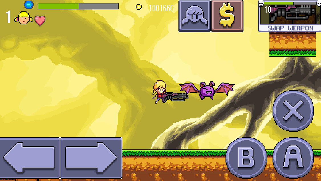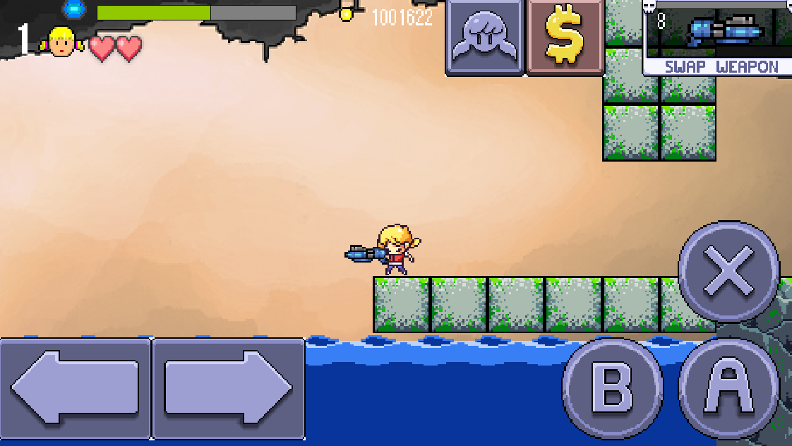 In Cally’s Caves 2, every time an enemy dies, they drop some coins. There are also coins hidden around the environments for the player to find. In secret spots, gems that are worth 100 coins are just waiting to be claimed. As coins are accrued, the player has the option of spending them on core attribute upgrades that power Cally up and eventually give her god-like powers. The store is accessed in the pause menu, and the items’ prices vary depending on the strength of the upgrade. Want to refill a heart temporarily before a big challenge? That’ll be 500 coins. Want to reduce every enemy’s hit points by a third? Well, that will be 100,000 coins. The upgrades will affect Cally’s core attributes, as opposed to her weapons. This system, like the HP system allows players that may not have much skill to brute force the progression. Even if they don’t defeat huge numbers of enemies in a single life, the player can slowly collect enough coins to buy upgrades even if they are dying frequently. After they’ve bought some upgrades, they will be better equipped to survive longer on their next life.