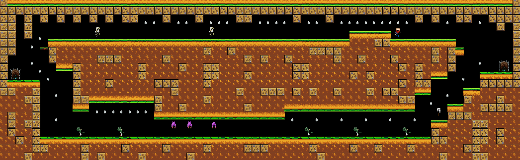 This next level (pictured above) is one of the simplest examples of alternate paths in Cally’s Caves 2. The player enters from the left and is confronted by a choice: should they take the higher or lower path? In some cases, the decision will be made for them by the gating. The upper path is only accessible if the player has bought the “triple jump” upgrade from the store. The upper path is also much easier to traverse, with far fewer enemies, and a larger coin reward. Players that take the lower path (either by choice or by not acquiring the triple jump yet), will have a harder time, but still reach the level’s exit if they can defeat the higher number of enemies. This level helps reinforce some of the game’s other systems, such as the upgrade shop. The player is most likely to try and reach the higher path when they enter the level, and if they don’t have the triple jump, they will attempt to reach the high path but fail. This will hopefully motivate them to buy the triple jump upgrade from the shop, so in this case the level design helps reinforce the game’s currency and upgrade shop systems. Having a level with a branching path like this also motivates the player to explore, and offers variety if they need or choose to replay the level.