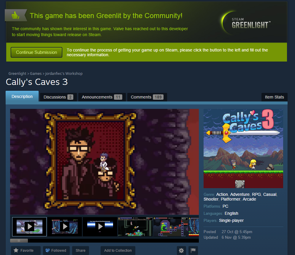 After ten days on Greenlight, with over 3000 yes votes, Cally’s Caves 3 has been Greenlit on Steam!!! We want to say a huge thank you to everyone that voted and helped us spread the word. We are hard at work on the Steam version, but we will post a development diary about our Greenlight experiences here soon!